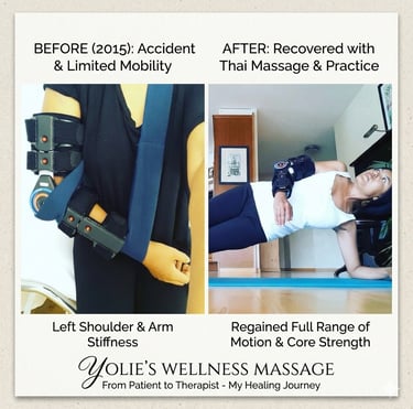 This photo shows my 'After.' It represents the moment I got my freedom back. The ability to fully extend my arms overhead without pain, to smile and breathe easy—this is what Traditional Thai Massage did for me. It gave me my life back.