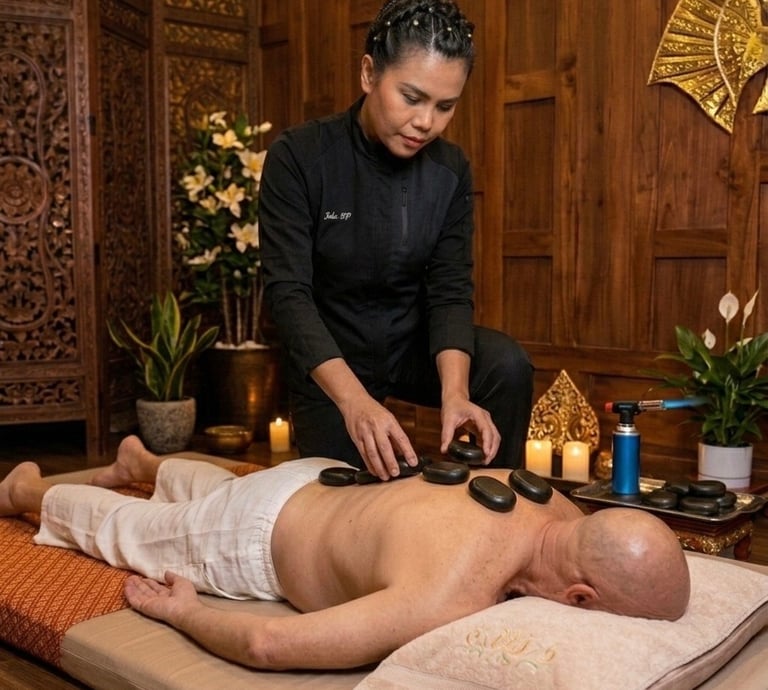 ☘️ The Process: Heated basalt stones melt muscle tension, allowing for deeper, more effective Thai assisted stretching. The heat penetrates to the deepest layers of the muscle for ultimate relaxation. Best for chronic stiffness and cold-weather recovery.
